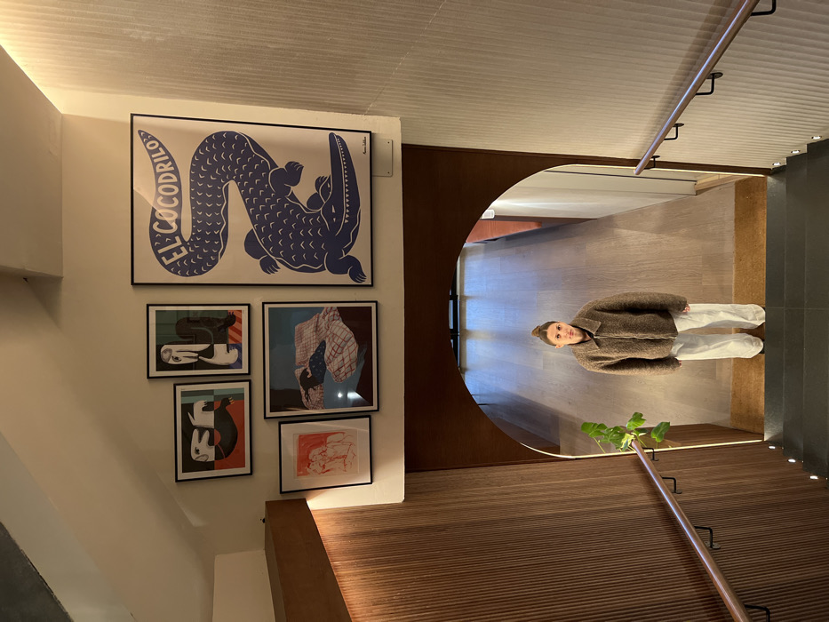 The image depicts the interior of the Hotel L&H La Latina, located in Madrid, Spain, specifically its stairwell and lower landing area. The perspective is from the top of a staircase, looking down. In the foreground, a dark gray staircase with integrated step lighting descends. Wooden handrails with black metal supports are visible on both sides. The wall to the left is clad in vertical wooden slats, partially obscuring a green plant with large leaves. At the base of the staircase, a wide, dark wood archway frames a lower landing with light-colored wooden flooring. A brown rectangular mat is positioned on the floor directly beneath the arch. Standing centrally on this brown mat, facing upwards towards the camera, is a single female subject. She has light brown hair pulled into a top bun. She wears a brown, textured, collared jacket with a zipper closure, and light-colored, wide-leg trousers. Her expression is neutral. On the white wall space above the archway, five framed artworks are displayed. The most prominent is a large vertical poster on the right, featuring a stylized blue crocodile forming the text "EL COCODRILO" against a white background, signed "Remo Llobet." To its left, four smaller framed pieces include abstract art, a figurative sketch in red tones, and a painting depicting a figure under a patterned blanket. The overall environment is modern and well-lit.