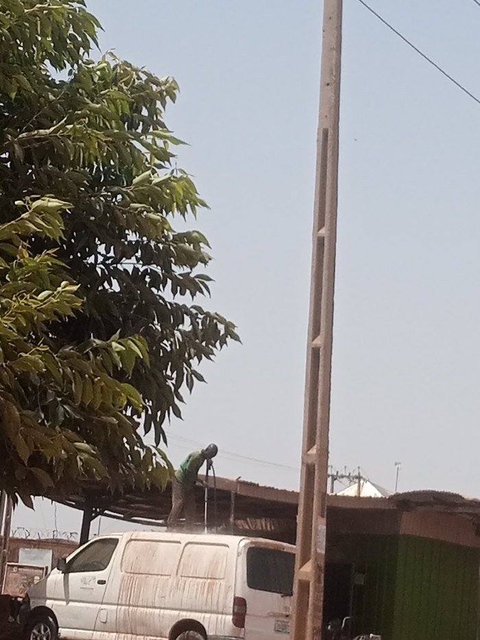 The image depicts an outdoor scene in Television, Nigeria, under a clear, bright sky. A male individual, wearing a green shirt, dark trousers, and a dark head covering, stands on the roof of a heavily soiled white cargo van, operating a hose or pressure washer, directing water downwards onto the vehicle. The van exhibits extensive reddish-brown mud splatter across its sides and roof, indicative of a cleaning operation. A large tree with dense green foliage occupies the upper left quadrant. A tall, light-colored concrete utility pole with multiple horizontal steps stands prominently on the right side of the frame, with power lines faintly visible. In the mid-ground, a covered structure with a corrugated metal roof is partially visible behind the van, alongside a building with a dark green lower facade and a lighter upper section. A white conical structure is discernible in the far distance against the horizon.