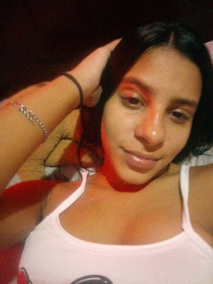 A close-up, dimly lit, indoor image depicts a young adult female posing for a selfie in Juan Griego, Venezuela