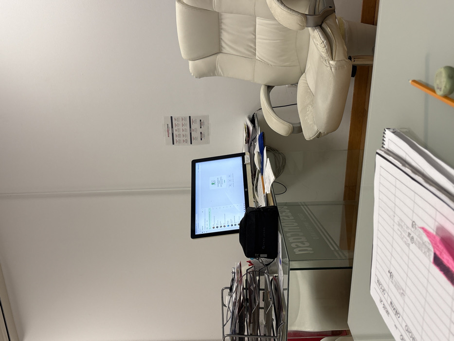 The image depicts an unoccupied real estate office, specifically an "Ocasioncasa" agency located in the city of Córdoba, Spain. In the foreground, a light-colored desk holds an open spiral-bound notebook with lined paper, a pink highlighter, a yellow pencil, and a green eraser. The midground features a modern glass-topped desk with a metal frame. On this desk, a multi-tiered metal paper organizer on the left is stacked with numerous documents. A black pouch, labeled "PEPE JEANS", sits in front of a flat-screen computer monitor displaying a communication application interface, likely WhatsApp Web, showing chat contacts on the left and a central "WhatsApp Web" logo. Various papers and cables are scattered around the monitor. To the right of the desk, a cream-colored, high-backed ergonomic office chair with armrests is positioned. The background consists of a plain white wall with a light brown baseboard. A small rectangular sign or poster titled "ocasión casa" is affixed to the wall above the office chair, featuring multiple lines of text or listings. No individuals are present in the scene, and no actions are occurring.