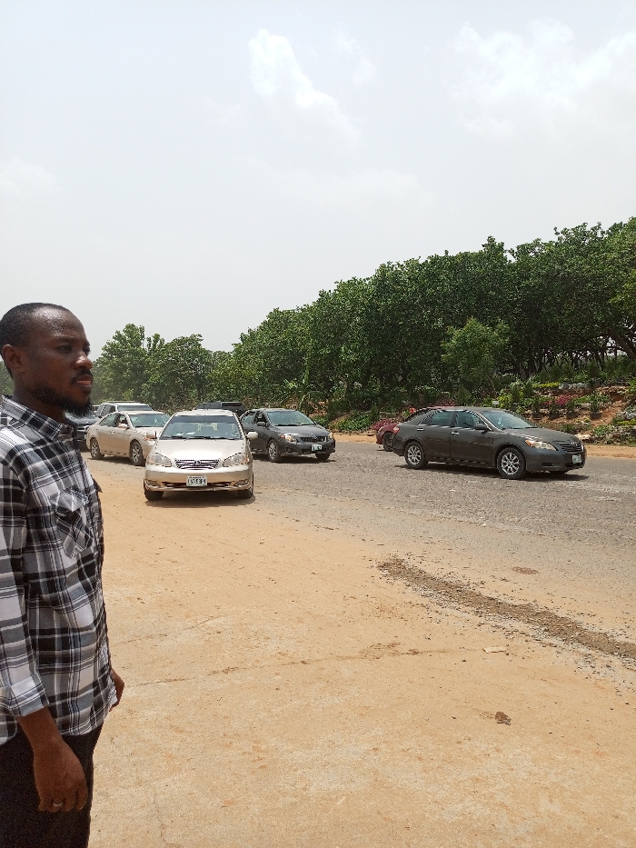 man in a plaid shirt standing on the side of a road in Karonmajigi, Nigeria, looking towards the cars driving past him