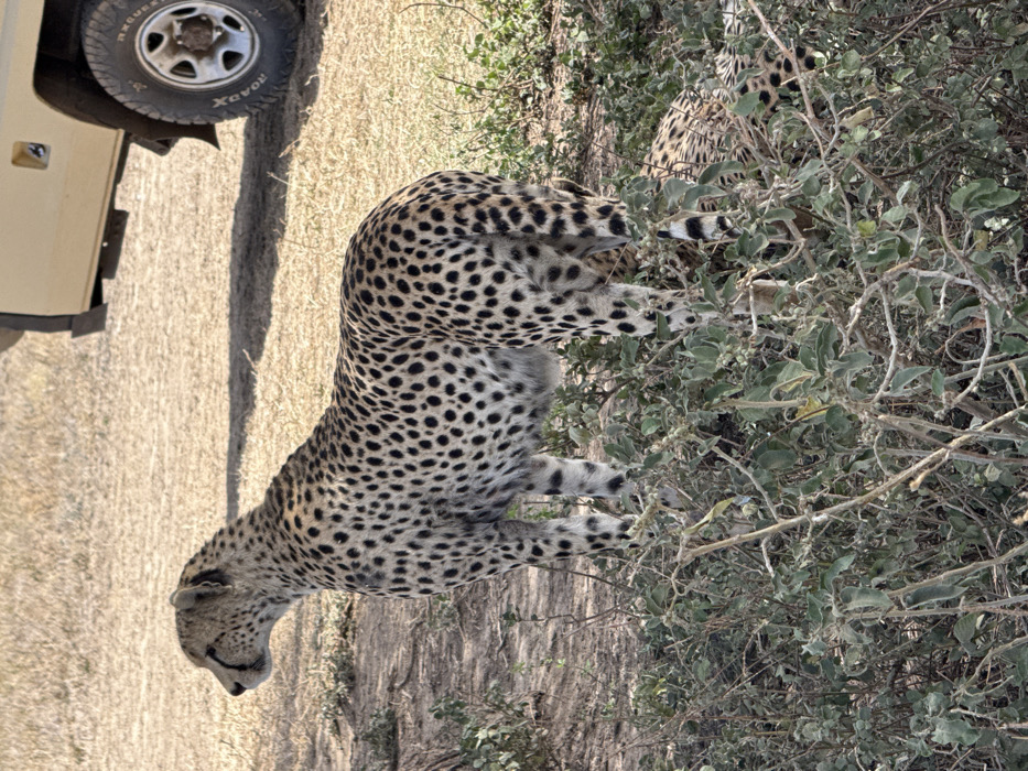 An adult cheetah stands prominently on dry earth, facing left in a natural, savanna-like environment consistent with Tanzania. Its spotted tan coat and distinct tear marks are visible. The animal's lower legs are partially obscured by green, leafy bushes and dry branches in the foreground. Directly behind the bushes, to the lower right, a second cheetah is partially visible, appearing to be lying down, with its spotted body and striped tail patterns evident. In the upper right background, the rear section of a light-colored off-road vehicle, likely a safari vehicle, is parked. The vehicle's rear wheel, featuring a "ROADX" tire, is clearly visible. The scene is illuminated by strong daylight, casting shadows on the ground. No people are visible.