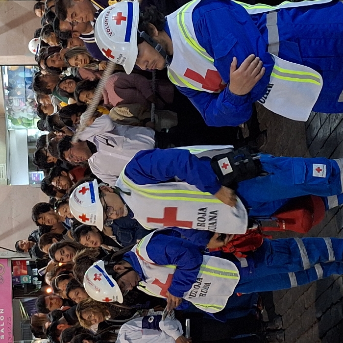 - "The image captures a street scene in Arequipa, Peru, featuring three Red Cross volunteers in the foreground positioned before a dense crowd" by FM-b0Aw43, licensed under CC BY 4.0