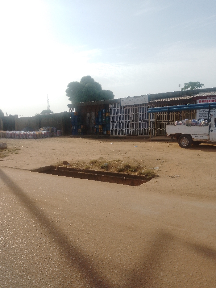 This image depicts a commercial street scene in Sabon Tasha, Nigeria, under bright daylight conditions