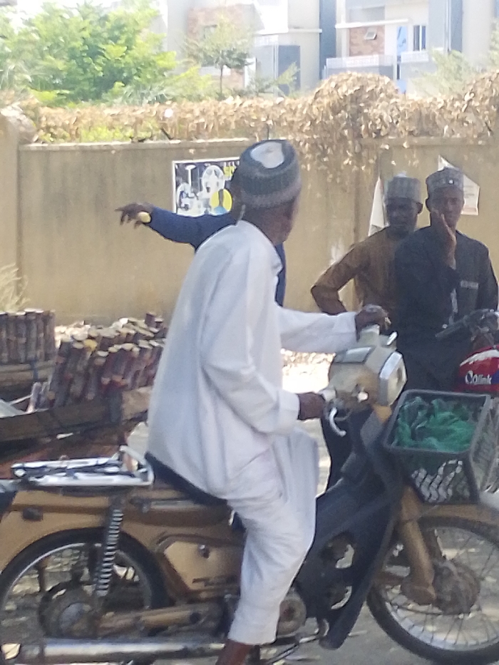A daytime street scene in Darmanawa, Nigeria, depicts four adult males and two motorcycles