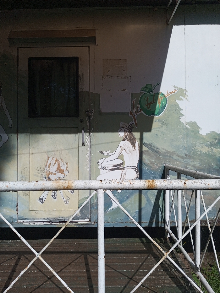 An exterior shot captures a building facade with painted designs. A door features a black-paned window and a crude fire drawing. To the right, a painted figure sits in meditation near a green apple logo reading "Vita Apfel Modena." A weathered white railing with a crisscross pattern frames the lower half of the image. The building and railing show signs of age and wear. Sunlight casts shadows, enhancing the contrast in the scene.