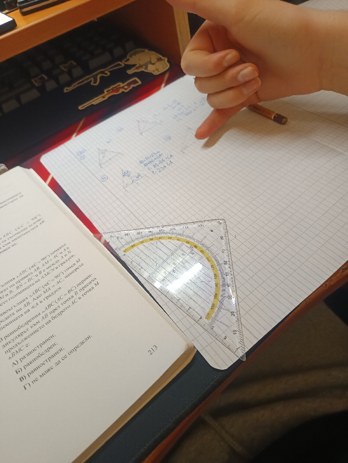 The scene depicts an indoor study environment in Dobrich, Bulgaria, observed from an elevated perspective. A light-skinned human hand is positioned in the upper right, performing a "shaka" gesture with the thumb and pinky extended, while the middle fingers are curled. The hand hovers over a white sheet of squared paper containing handwritten notes and geometric diagrams in blue ink. An open textbook with Cyrillic text in Bulgarian and the visible page number "213" rests on a dark blue surface to the left. A transparent plastic protractor, shaped as a set square with yellow angle markings, lies across the open textbook and the squared paper. A reddish-brown wooden pencil is visible on the squared paper to the right of the hand. In the upper left background, part of a keyboard is visible beneath an orange-brown wooden shelf. On a blue surface behind the keyboard, two stickers depicting assault rifles and one indistinct graphic are present.