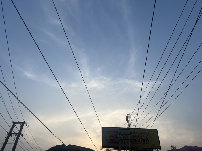 A low-angle shot showcases a blue sky with wispy clouds. Power lines crisscross the view, converging toward a billboard advertising "Double Cubes." The billboard is positioned in the lower center of the frame. A power pole stands on the left, while a cellular tower rises behind the billboard. The horizon is partially obscured by structures and foliage. The overall lighting suggests either dawn or dusk.