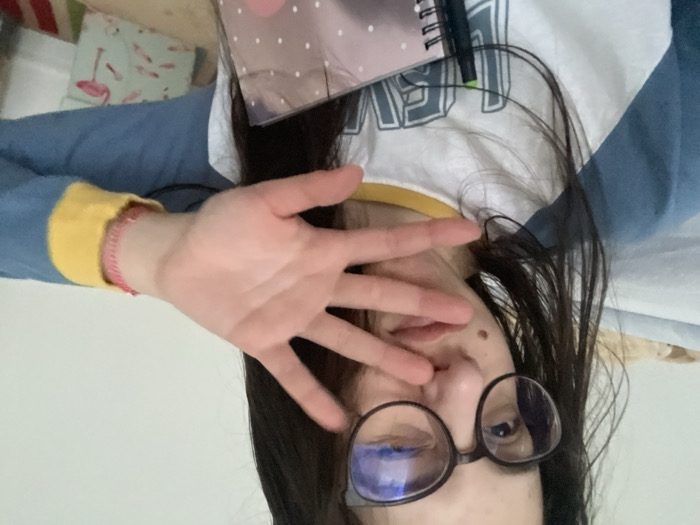 A close-up photograph depicts a female individual indoors in Marten, Bulgaria. She has dark hair and wears dark-framed glasses, reflecting a blue light source. A mole is present below her right eye. Her left hand is raised, fingers splayed, obstructing the lower portion of her face from the nose downwards. She wears a white shirt with blue raglan sleeves and a yellow cuff on her right sleeve. A red braided bracelet is visible on her right wrist. A pink, polka-dotted spiral-bound notebook with a dark pen clipped to it is held on her right side. The background shows a light-colored wall and a pillow or cushion with a pink flamingo pattern on a light base.