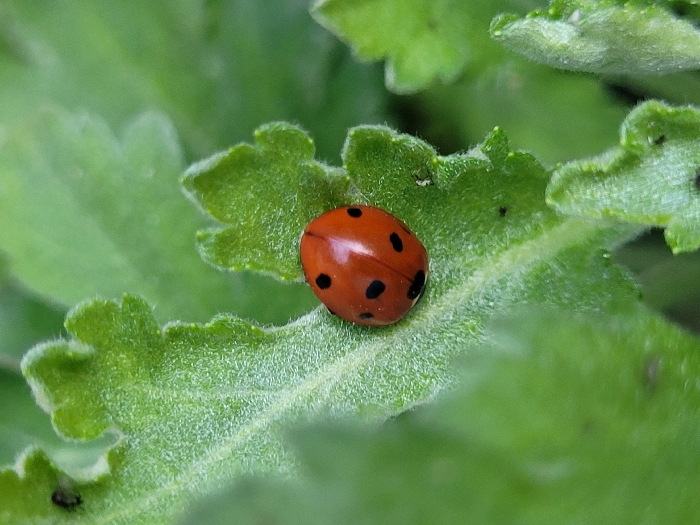 - "A single Coccinellidae (ladybug) with a bright red, oval body and multiple black dorsal spots is observed resting on a green leaf in Cherven Bryag, Bulgaria" by FM-laGG22, licensed under CC BY 4.0