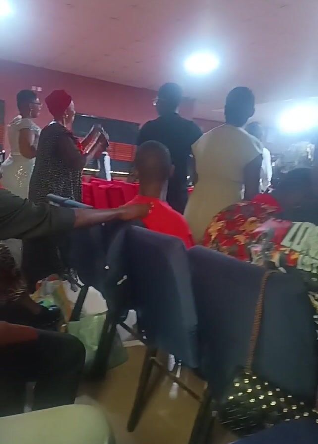 room with rows of blue chairs, most of which are occupied by people. In the front of the room, a woman in a black and white patterned dress and a red headwrap is speaking into a microphone. Several people are standing and moving around, some appear to be dancing or clapping along to music. A person in the foreground is seated, wearing a black t-shirt and looking at a laptop displaying computer code. The environment appears to be a meeting hall or church. The lighting is bright and the camera is held by someone sitting in the audience. The text "Shot on POWER P55" appears in the bottom left corner of the frame.