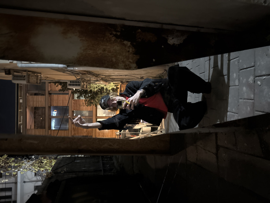 The image depicts a night scene in an urban alleyway in Tel-Aviv, Israel, captured as a selfie in a full-length mirror. A lone individual, appearing male, is seen crouching in the reflection, dressed in a black baseball cap, a black jacket, a red shirt, and black pants. The cap features a light-colored logo. The individual is holding a smartphone in their left hand, presumably for taking the photograph, with a yellow attachment visible. Their right arm is raised, hand forming a "rock-on" gesture with the index and pinky fingers extended. The background, visible through the mirror, reveals a modern multi-story building with a wooden facade and multiple windows. Illuminated Hebrew text, specifically "פריטים" (Pritim, meaning "items" or "articles"), is visible through one of the building's windows, indicating a commercial establishment. To the right of this building, several external air conditioning units are mounted on a plain wall. A tree with some foliage is present between the modern building and the wall with AC units. Construction materials, including white buckets and scaffolding, are partially visible to the left of the wooden building. The ground where the mirror stands is paved with gray rectangular blocks. The immediate surroundings are dimly lit, suggesting nighttime, with artificial light sources illuminating the central subject. The mirror itself appears aged or weathered, with what resembles rust or discoloration on its right side and frame.