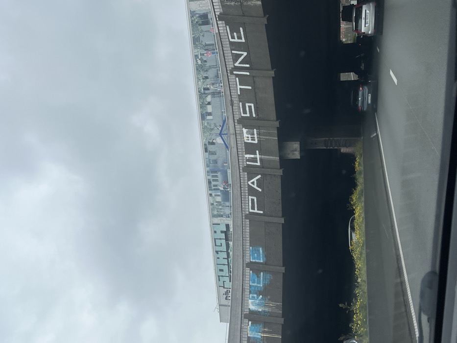 The image depicts a multi-lane roadway in Lille, France, viewed from inside a vehicle on an overcast day. A concrete overpass spans the road. On the visible wall of the overpass, white graffiti spells "PALESTINE," while to its left, blue graffiti, partially obscured, spells "FREE" with paint drips below. Above the overpass, a long building features a large mural depicting a train car, trees, and several small human figures in a park-like setting. On the left side of this building, light blue graffiti reads "SORGA" with smaller white text "môli" below it. Below the overpass, the road continues into a dark tunnel section. Multiple vehicles are present on the road, including a dark blue Renault Clio and a white SUV (possibly a Dacia Duster) in the foreground. A grassy median with yellow wildflowers is visible to the left of the road leading into the underpass. No distinct individuals are visible other than the figures in the mural.
