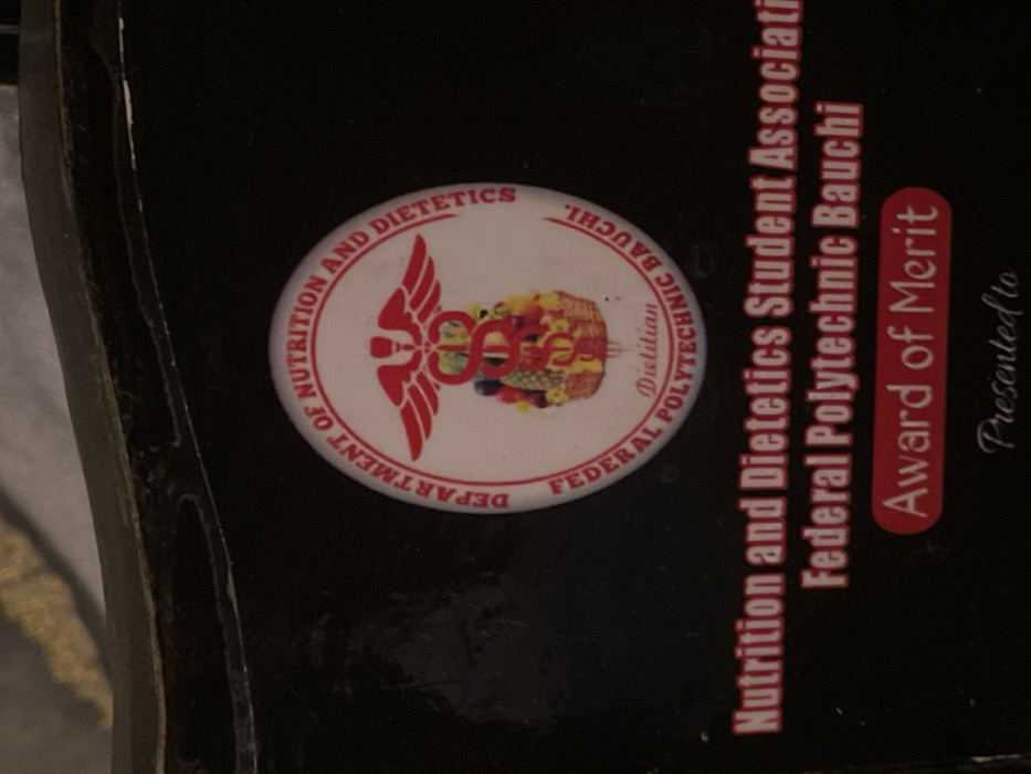 A close-up image displays a dark, possibly black, surface, likely a plaque or certificate, featuring a circular white emblem and red and white text. The emblem, centered in the upper portion, contains red text outlining its perimeter: "DEPARTMENT OF NUTRITION AND DIETETICS" at the top and "FEDERAL POLYTECHNIC BAUCHI." at the bottom. Within the emblem, a red Caduceus symbol (staff with two intertwined snakes and wings) is positioned above a brown basket overflowing with colorful fruits (including bananas, grapes, pineapple, apples, and berries) and potentially vegetables. Below the basket, the word "Dietitian" appears in small red text. Below the emblem, prominent red capital lettering reads: "Nutrition and Dietetics Student Association" followed by "Federal Polytechnic Bauchi." Directly beneath this, a red rectangular box contains the white capitalized text: "Award of Merit." Partially visible below the red box, the words "Presented to" are rendered in a decorative, light-colored script font. The top edge of the overall object shows a slight curve and some minor wear, with a blurred, indistinct gold/yellow element visible in the background at the very top. The scene is located at Federal Polytechnic Bauchi, in Bauchi, Nigeria.