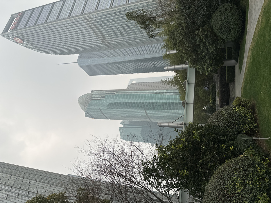 Skyscrapers pierce a hazy sky, viewed from ground level. A mix of modern glass towers, including one with a curved top, loom above the trees. Green bushes and a bare tree branch frame the foreground. A walkway with silver supports runs along the right. The overall tone of the image is muted and urban.