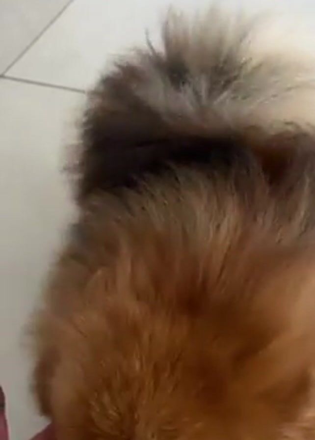 small, fluffy, orange Pomeranian dog sitting on a tiled floor. A hand with a gold ring on one of the fingers pets the dog on the head. The dog has large, dark eyes, a small nose, and a fluffy tail. The floor is shiny and light-colored.