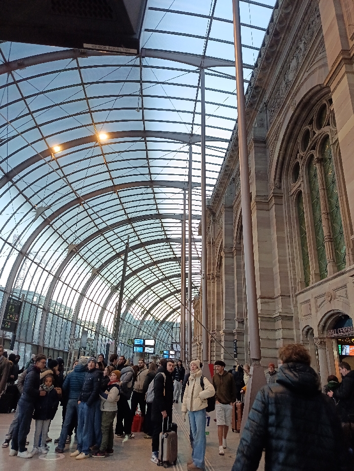Inside a grand train station, a vaulted glass ceiling arches high above. A multitude of people, clad in various winter attire, stand and walk across the platform. The station's architecture boasts tall, ornate stone walls with arched windows. Digital signage displays train schedules. Bright lights illuminate the bustling scene, reflecting off the glass ceiling.