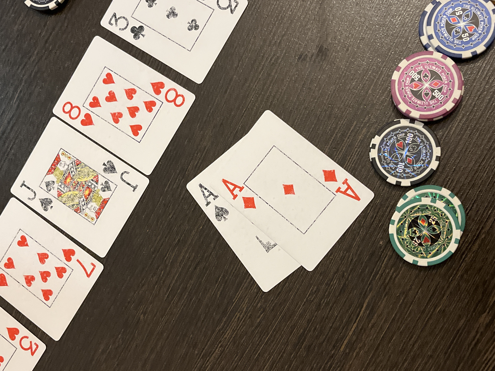 poker game in progress on a dark wooden table