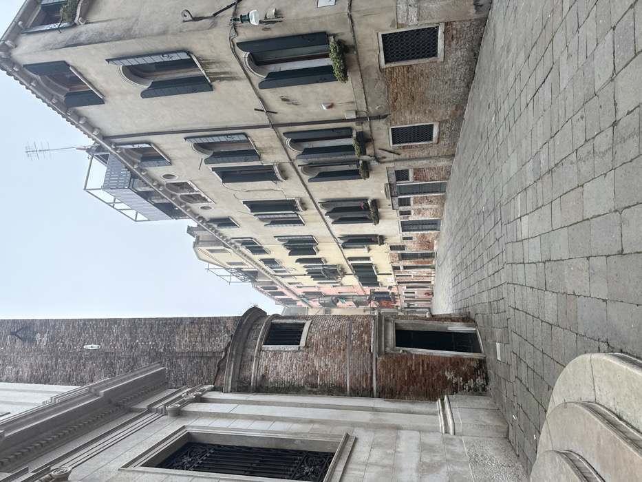The image depicts an empty, narrow calle (street) in Venice, Italy, under an overcast sky. The foreground features grey stone block paving (selciato). To the left, a large, light-colored building, likely stuccoed stone, exhibits classical architectural details, including ornate window grilles and molded cornices. Adjacent to this, a weathered brick campanile or tower rises, featuring a curved base with a small, dark wooden door and a barred window. The right side of the calle is lined with multi-story historic buildings with various pastel facades (pale yellow, light pink, beige) and exposed brick foundations at street level. These buildings feature numerous windows, predominantly fitted with dark green wooden shutters, many of which are partially open. Several windows on the upper floors contain small flower boxes with green plants. Ground-level access consists of multiple dark, recessed doorways. A traditional street lamp with a white glass globe is mounted on the corner building on the right. Rooftops display modern elements such as television antennas and a metal structure, possibly a terrace enclosure or utility installation. No individuals or active interactions are present in the scene.
