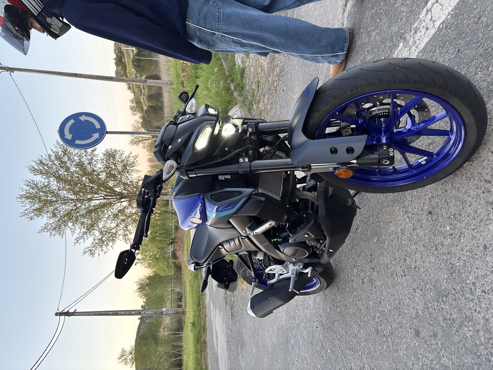 A blue and black Yamaha MT-125 motorcycle is parked on an asphalt road, at an angle