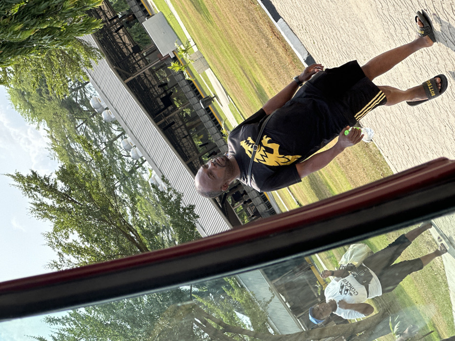 The image depicts an outdoor scene in Ozuaha, Nigeria, under bright daylight. The perspective is from inside a vehicle, indicated by a dark-colored structural element and partial reflections on the left side of the frame. In the foreground, slightly to the right, a dark-skinned adult male stands on a light-colored, patterned paved surface. He wears a black short-sleeved t-shirt featuring a gold or yellow stylized lion graphic, black shorts with three gold or yellow stripes on the left leg, and black slide sandals with "BOTTEGA" in gold/yellow text. A black shoulder bag is worn across his chest. He holds a clear plastic water bottle with a light green cap in his left hand. His gaze is directed towards the viewer's left. Further back and to the left, partially obscured by reflections, a dark-skinned adult female stands on a grassy area. She wears a blue baseball cap, a white short-sleeved t-shirt with a dark logo, dark capri pants, and light-colored sandals. She has a black fanny pack or waist bag and carries a light-colored bag over her left shoulder. Her right arm is raised. The background features a maintained grassy area and numerous green trees. A large, open-sided structure with a light-colored, sloped roof is visible behind the grass. The roof is equipped with multiple dome-shaped ventilation units. Rows of seating are discernible beneath the structure. A black and white striped curb or barrier separates the paved surface from the grassy area. The sky above is light blue with sparse white clouds.