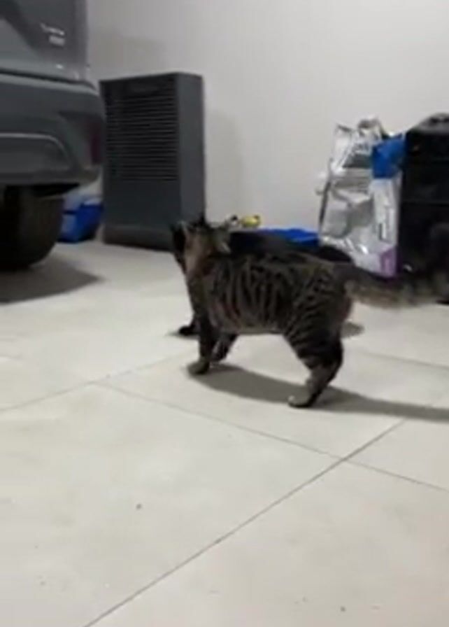 garage scene with a light-tiled floor where two cats are interacting