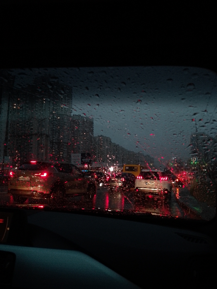 - "The image depicts an urban street scene in Kyiv, Ukraine, viewed from inside a vehicle through a rain-splattered windshield during low light conditions, likely dusk or night" by FM-zDkzX2, licensed under CC BY 4.0