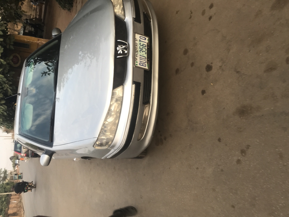 A silver Peugeot car is parked on the side of a road. Its license plate reads "BUU 356 TO" and indicates it is from Plateau. The car is positioned at an angle, with its front end facing the viewer. The road appears to be paved and has some dark stains. A motorcycle is visible further down the road. Trees and buildings are present in the background.