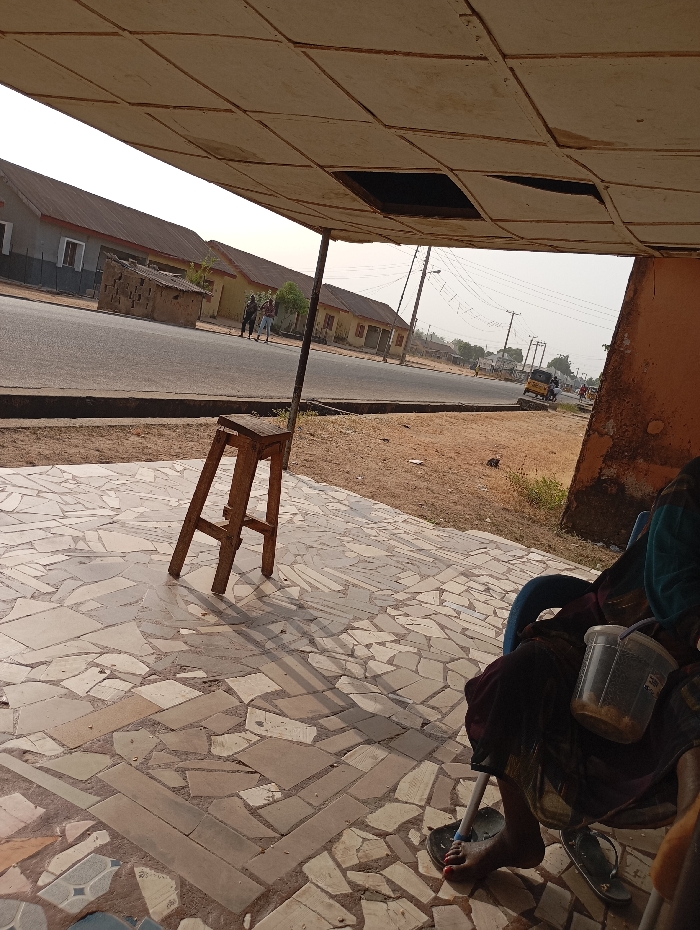 An open-air structure with a tile roof partially covers a scene including a road, buildings, and a few people walking along the roadside. Underneath the structure, a stool casts a shadow on the tiled floor. A person sits in a chair on the right, and an open container rests on their lap. The foreground shows detailed tile work. The scene is set in what looks like a small town.