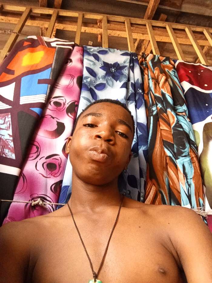 A shirtless young man wears a necklace with a green and yellow pendant. He poses with pursed lips. Colorful fabrics hang behind him in shades of blue, pink, orange, and brown, featuring floral and abstract patterns. Wooden beams are visible above. The image has a warm, slightly yellow tone, suggesting indoor lighting.