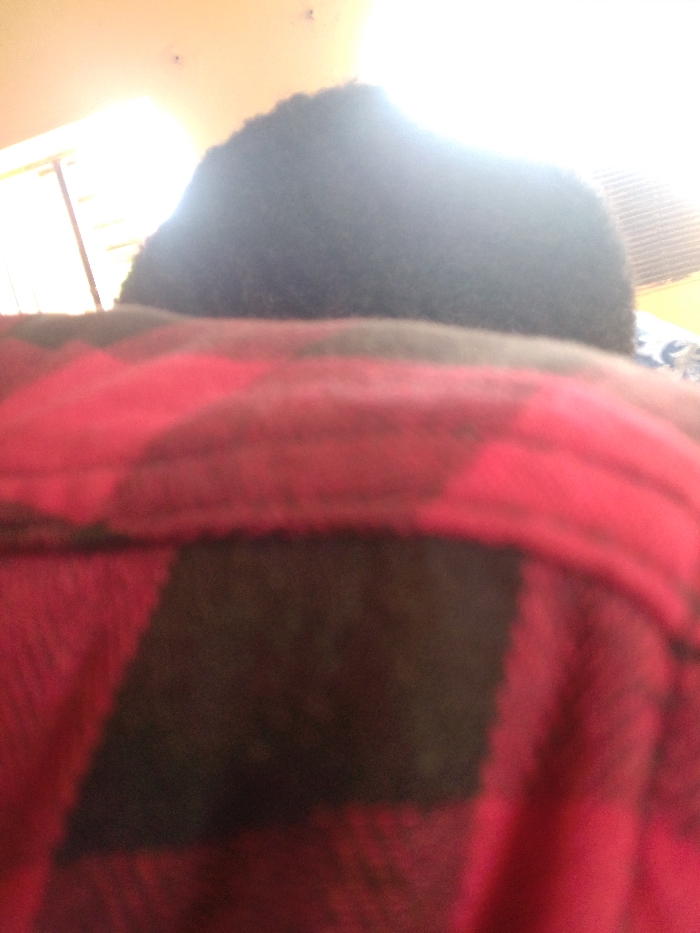 The image displays the upper back of an individual, positioned indoors within the city of Saminaka, Nigeria. The primary subject is wearing a red and black buffalo plaid shirt, characterized by its soft, potentially flannel-like texture, with the back collar and shoulder seam visible. Above the shirt, the dark, voluminous hair on the back of the individual's head is silhouetted against an extremely bright, overexposed light source in the background. To the left of the head, a vertical light-colored structure, possibly a window frame or blind, is partially visible. To the right, a horizontal ribbed object, potentially a window blind or air vent, is faintly discernable amidst the intense light. The ceiling above appears light-colored, with two small dark specks visible near the top center. No specific actions or interactions are discernible.