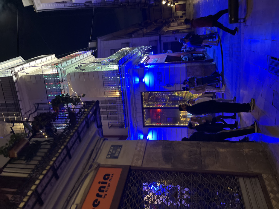 A narrow street at night is lit with blue lights. People stand outside a building with windows adorned with bright decorations. Above, a building is decorated with lights. A sign for "Placa del Tossal" is visible on the side of a building. The scene appears to be a festive or holiday celebration in a European city.