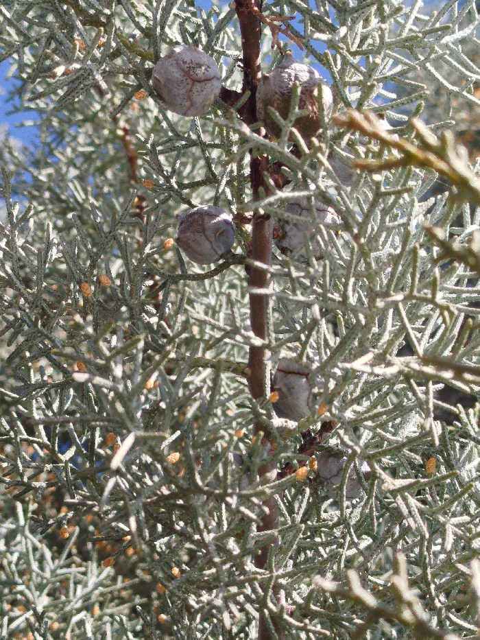 A close-up photograph depicts a section of a coniferous tree branch, identified as being located in Klenovik, Bulgaria. The primary subject is dense, grayish-green, scale-like foliage. Interspersed among the foliage are several globose to ovoid seed cones, varying in size, exhibiting a textured, grayish-brown surface. Multiple small, ovoid, orange-brown structures, likely male pollen cones, are also visible throughout the dense foliage. The plant material is supported by slender, reddish-brown stems. The background consists of out-of-focus patches of bright blue, indicative of a clear sky. No human subjects, actions, or interactions are present in the scene.