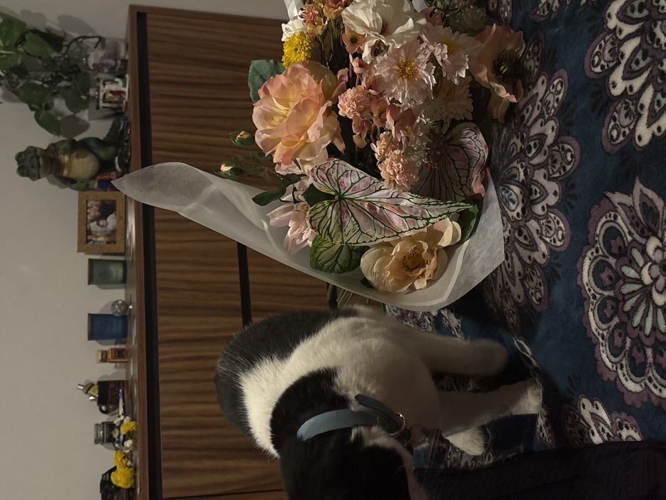 An indoor scene in Santa Clara Ocoyucan, Mexico, displays a black and white domestic cat near a multi-colored floral bouquet