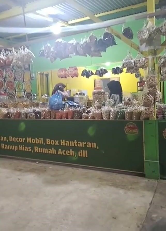 A food stall is set up indoors. The stall's banner lists offerings like wedding services and Aceh-style houses. The stall is stocked with various packaged foods, likely snacks or treats, displayed in bags and jars. Two women in hijabs are behind the counter, presumably working at the stall. There's general movement as they handle goods, possibly assisting a customer. Decorations hang above. The area is well lit and the floors are concrete.