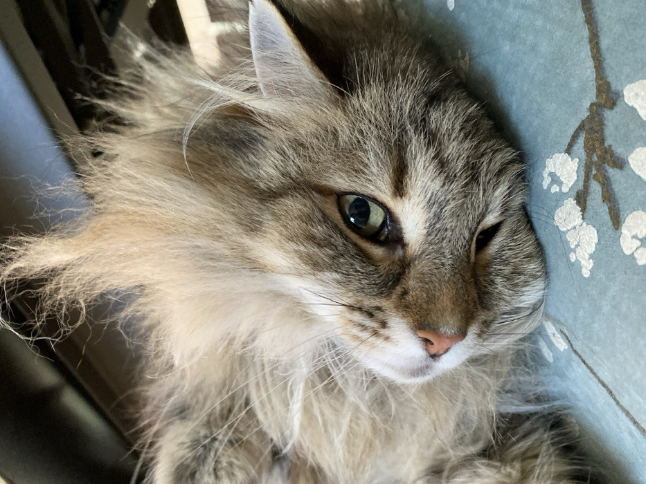 - "A domestic long-haired cat with a brown and cream tabby coat and prominent shaggy fur around its head is depicted in a close-up, diagonal orientation" by FM-3x3sP2, licensed under CC BY 4.0