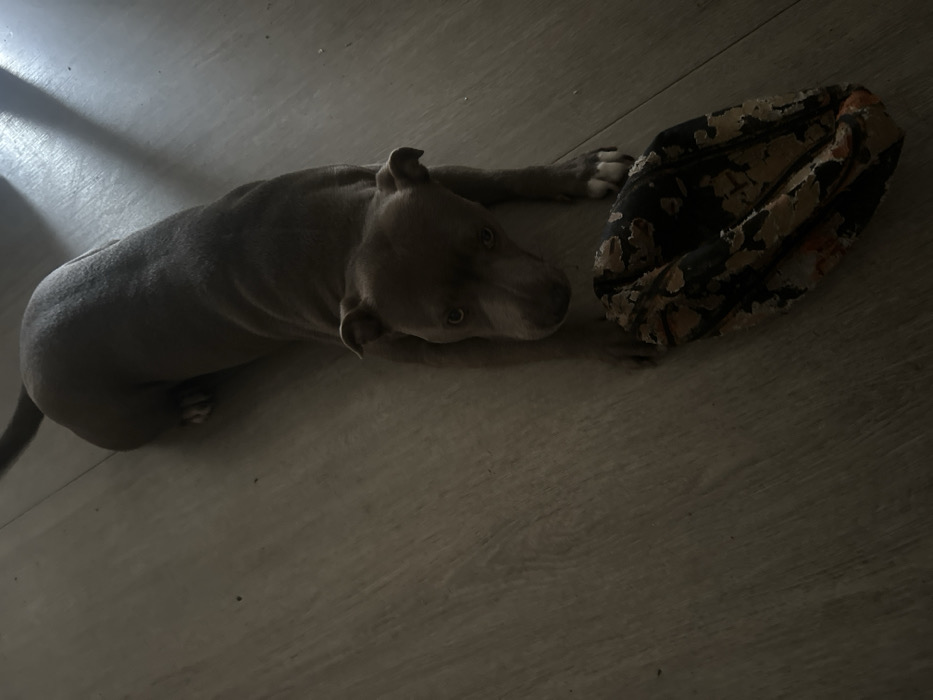 - "The image displays a grey-blue pit bull-type dog lying prone on a light-colored wooden floor in an indoor setting" by FM-0OqHq2, licensed under CC BY 4.0