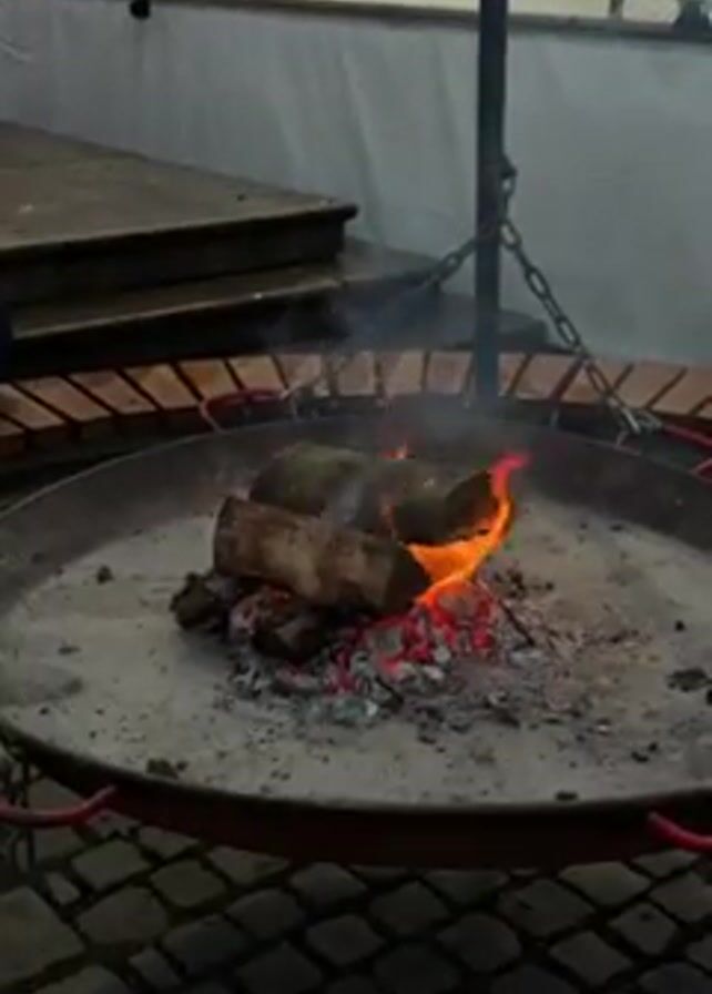 metal fire pit with a log fire burning inside. The fire is surrounded by ash and embers. The fire pit is hanging from a chain. There is a set of steps in the background and a white wall. People can be heard talking in the background. The surface beneath the fire pit is made of gray paving stones.