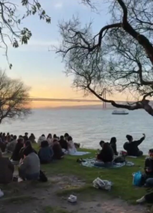 A wide-angle shot captures a group of people gathered on a grassy hill overlooking a bay at dusk. Many are sitting on blankets, facing the water, some are taking photos. In the background, a long bridge stretches across the water towards the horizon, a boat moves across the water beneath it. The sky transitions from pale blue to orange and pink at the horizon. Tree branches frame the shot in the foreground, obscuring parts of the sky and the view of the group. The ground is uneven, with exposed tree roots.