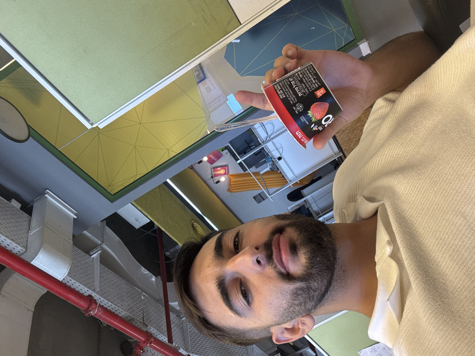 An interior self-portrait taken in a modern office environment in Holon, Israel, captures a young adult male. The male, facing the camera, has dark hair and a short beard. He is wearing a light-colored, textured collared shirt. He holds a small black and red "Müller PRO" strawberry yogurt cup with a clear plastic spoon inserted, positioned in his right hand. The background features an industrial-style ceiling with exposed red fire suppression pipes, white cable trays, and ventilation ducts. Overhead, yellow sound-dampening panels with a geometric pattern are visible, alongside sections of grey and light green walls/partitions. Distant office furniture, including desks and computer monitors, and decorative elements like posters and an orange inflatable structure, are discernible further back.