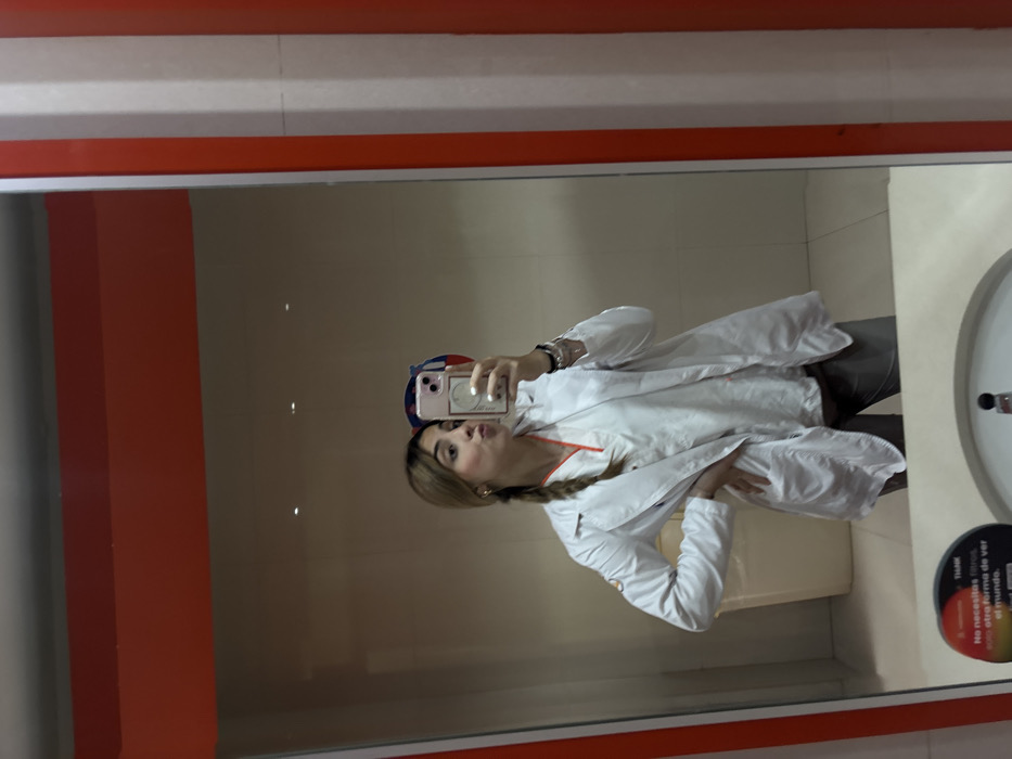 A female individual is depicted taking a mirror selfie in an indoor setting within Chablekal, Mexico. She is reflected wearing a white lab coat over a light-colored scrub top with orange trim and grey trousers. Her light brown hair is styled in a braid over her left shoulder, and she poses with puckered lips. Her left hand rests on her hip, while her right hand holds a light pink smartphone, equipped with a white magnetic accessory, aimed at the mirror. Multiple bracelets adorn her right wrist. The background includes off-white walls, a partially visible beige rectangular trash receptacle to the left of the reflection, and a sink basin with a faucet below the mirror. A circular sign with red, black, and yellow elements, partially obscured, is present on the counter in front of the sink, displaying Spanish text. Vertical red and white stripes are prominent on a structural element to the right, and a horizontal red band runs along the top of the wall, reflected in the mirror, which also shows recessed ceiling lights.