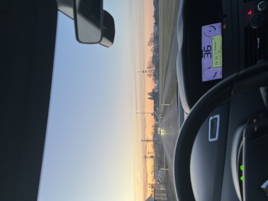 The image depicts a twilight scene captured from the interior of a vehicle, specifically on the outskirts of Memmingen, Germany. The sky shows a clear gradient from light blue overhead to orange and yellow at the horizon, indicating either a sunset or sunrise. Given the digital clock displaying "19:22" (7:22 PM), the time is confirmed as dusk. Inside the vehicle, the dark gray steering wheel occupies the lower central portion of the frame, with a partial vehicle emblem (consistent with Citroën) visible at its base. Three green indicator lights are illuminated below the steering wheel. To the right, the dashboard features a digital display showing "36" prominently, likely indicating speed in kilometers per hour. Below this, "19:22" (time) and "87.50 MHz" (radio frequency) are legible. A rearview mirror is positioned in the upper right quadrant of the windshield. Outside the vehicle, an asphalt road extends forward. Several vehicles with illuminated headlights are visible approaching in the distance. The left side of the road features what appear to be industrial structures or buildings and multiple large electricity transmission pylons. The right side of the road borders an open, grassy field, with a single street light pole visible in the mid-distance. More electricity pylons and a line of trees and buildings are present on the distant horizon. The overall environment suggests an industrial or semi-rural area at the edge of the city. No people are explicitly visible, and no direct interactions are depicted.
