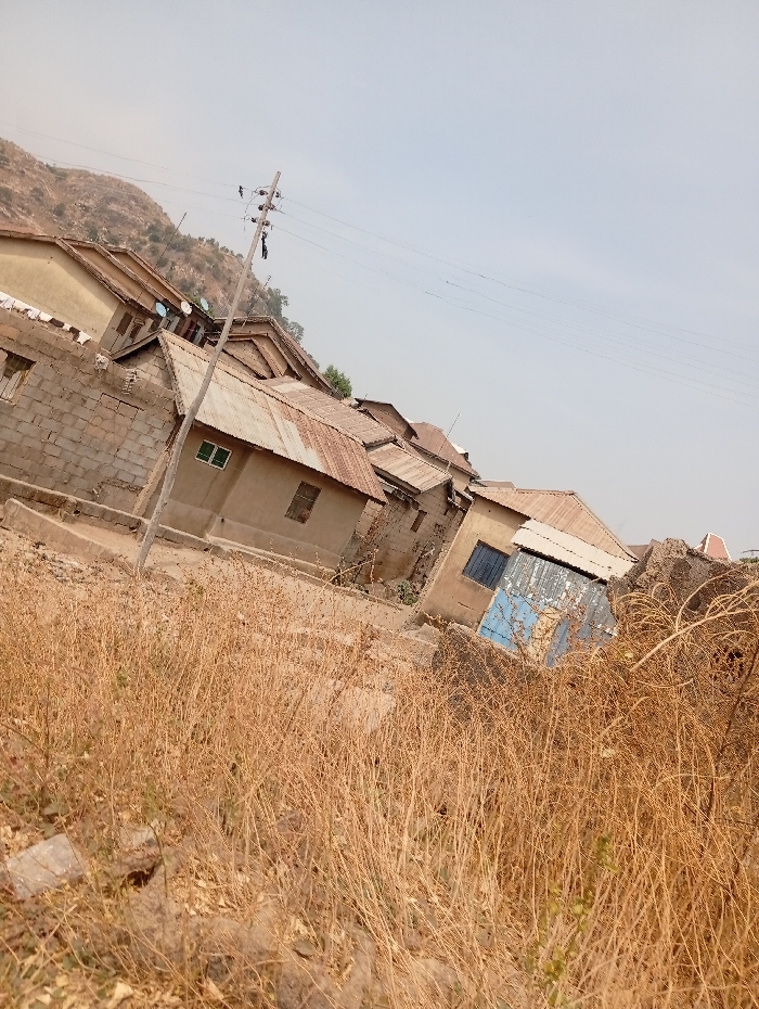 The image depicts a semi-urban scene in Madalla, Nigeria, characterized by dry, expansive terrain under a hazy sky