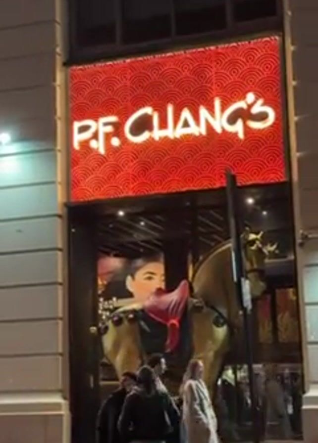 exterior of a P.F. Chang's restaurant at night. The camera zooms in on the entrance, revealing a glowing neon sign with the restaurant's name against a backdrop of red patterned circles. Inside the entrance, there are two large decorative golden horses. Behind one of the horses, a mural of a woman's face is visible. People are walking around in front of the restaurant.