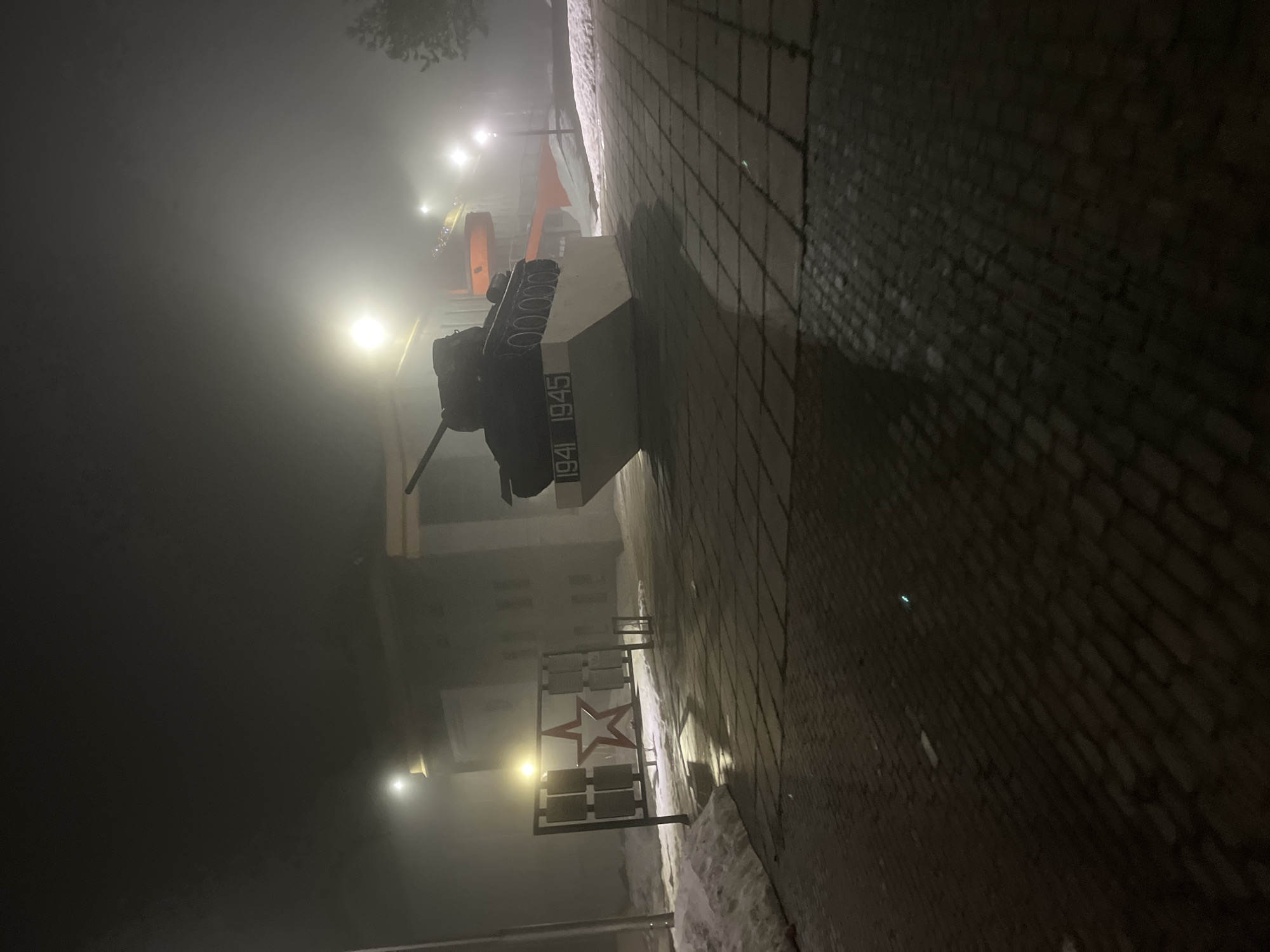 The image depicts a Soviet-era tank memorial in the city of Марковский, Russia, at night. The scene is shrouded in heavy fog, obscuring details of the surrounding environment. The tank, mounted on a concrete plinth inscribed with "1941 1945", is the central subject. A sign with a red star is also visible. The ground is a brick pavement with some snow or ice. Streetlights illuminate the scene but are partially obscured by the fog. The overall atmosphere is somber and ethereal.