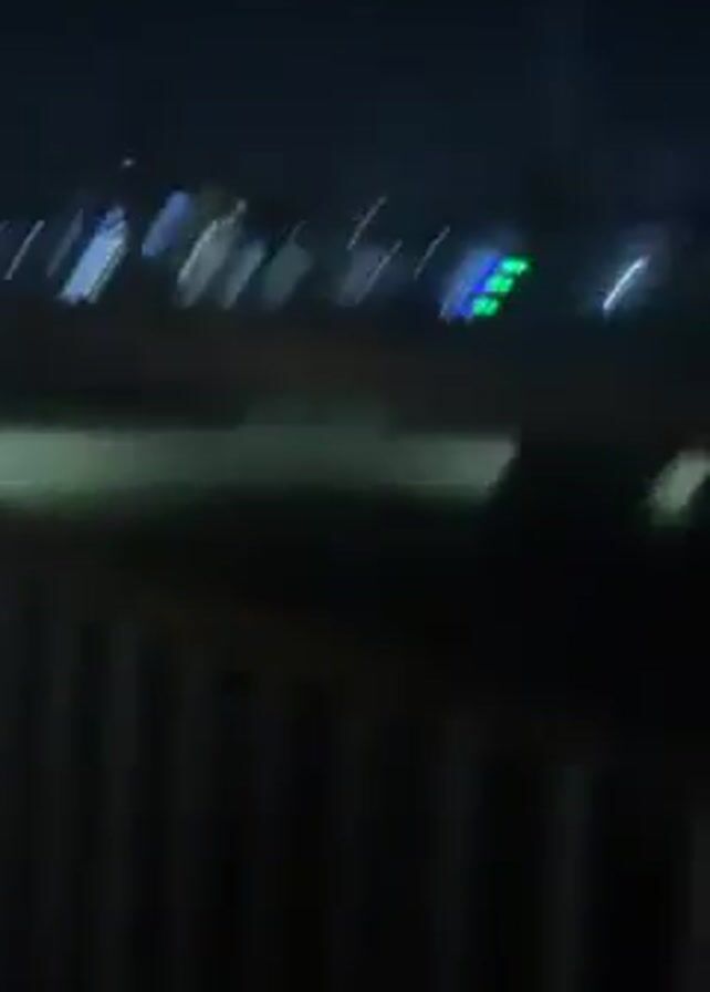 night scene, initially obscured in darkness before revealing a distant cityscape with various lights. There are buildings, vehicles with headlights and taillights, and possibly a tower emitting a beam of light. The camera is positioned behind a railing, and the scene shifts to a blurry view of traffic on a highway. The video ends with the scene obscured by fog or haze.
