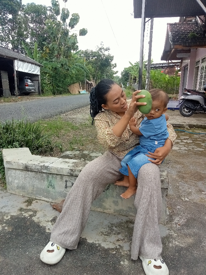 A woman with dreadlocks sits on a concrete ledge, holding a young child in her lap. She wears a floral blouse and wide-legged brown pants, along with slip-on shoes with faces drawn on them. The child wears a blue t-shirt and denim shorts. The woman holds a large green mango over the child's head, seemingly about to balance it. The background includes a road, houses, trees, and a parked scooter. The image is taken outdoors on a cloudy day.