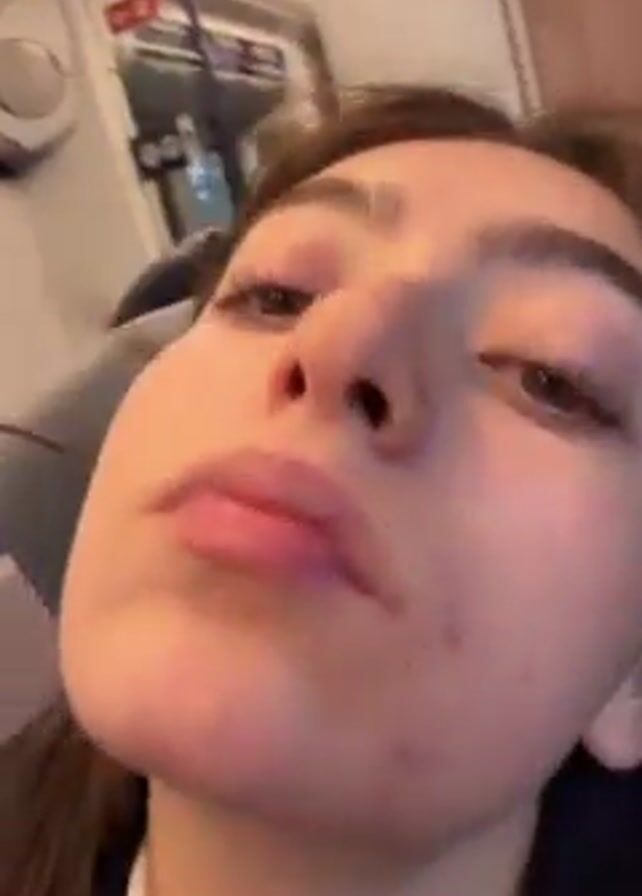 A close-up video shows a woman applying mascara to her eyelashes while on a train