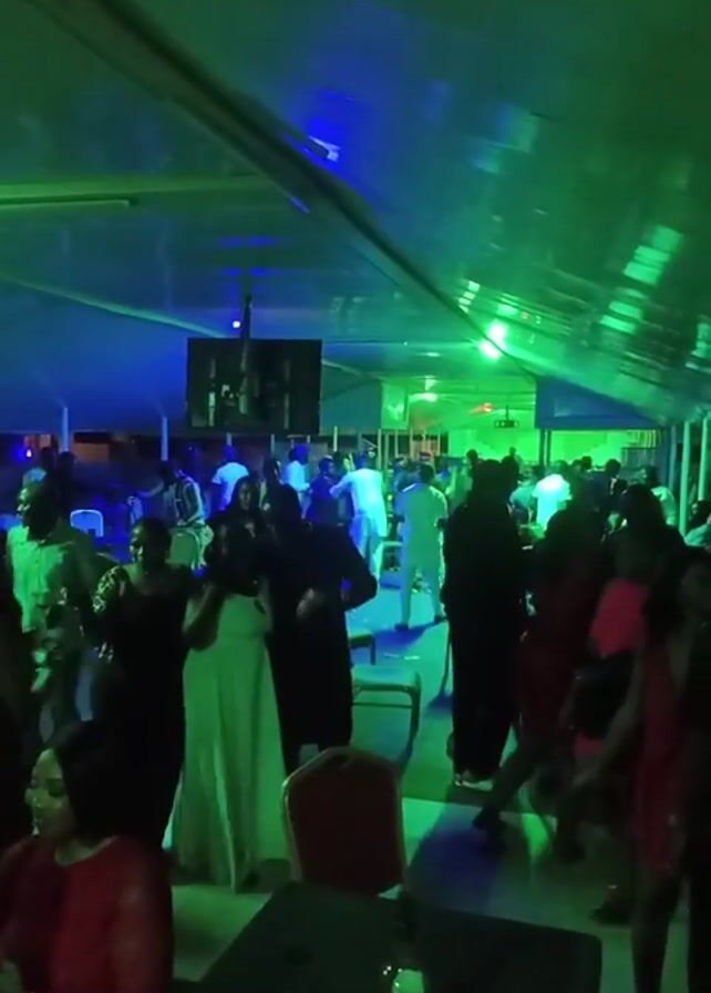 party happening inside a large tent or structure with a low, flat ceiling. Green and blue lights illuminate the scene. Many people are present, appearing to dance or socialize in a crowded area. Most figures are silhouetted against the light. Some individuals wear bright clothes. Chairs and tables are scattered around the room, some with drinks or a bottle on top.