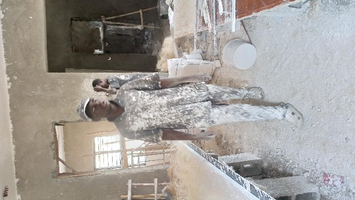 An indoor construction site in Unknown, Unknown, shows two males and various building materials. The foreground features a male subject, mid-stride, walking towards the viewer. He is covered in white plaster or dust on his light-colored cap, short-sleeved collared shirt, pants, and light-colored clogs. His gaze is directed slightly to his right. To his left, a long, flat white board or panel rests horizontally on two concrete cinder blocks. The floor is uniformly covered in fine white particulate matter. In the mid-ground, to the right of the main subject, several stacks of white-bagged material are visible, alongside a white cylindrical bucket lying on its side. In the background, through a doorway to the left, another male individual is partially visible, raising his right hand towards his head. Beyond that doorway, a window with horizontal bars and wooden scaffolding are discernible. Further right in the background, another doorway leads to a dimly lit area containing more wooden scaffolding structures and debris. The walls throughout the space appear to be unfinished or freshly plastered in a light gray tone.